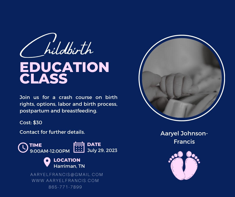 The class will be held on Saturday, July 29th, from 9am-12pm in Harriman, TN. Address will be given upon registration. Educational materials & light refreshments will be provided. There will be also be access to a private Facebook group for ongoing support. For registration or questions, please contact directly via email (aaryelfrancis@gmail.com) or via text (865-771-7899).